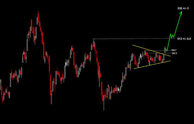 Tín hiệu Bollinger kết hợp với tín hiệu Parabolic + khối lượng cho thấy nhịp sideway trong dải 495 - 504 đã kết thúc